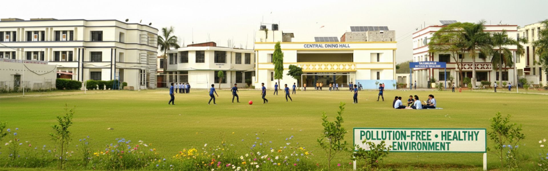 The school offers smart classrooms, a robotics lab, pollution‑free campus, spacious playground, library, sports, arts, and special spoken English classes